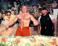 الرجل الاقوى في بولندا ماريوس بوزيانوفسكي يستعد لالتهام اكبر وجبة لازاينا في العالم بمطعم (بلانيت هوليوود) في هونج كونج امس.
