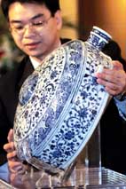 جيسون تسى مدير قسم الخزف الصيني في شركة مزادات سوذيبي يعرض قارورة زرقاء وبيضاء اللون من عصر اسرة بينح (1403 1424م) في هونج كونج ويبلغ ارتفاع القارورة 2,47 سنتيمترا وقد وصل سعرها في المزاد 902,773,2 محطمة الرقم القياسي في هذا النوع من الخزف الازرق والابيض.