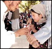 طفلة افغانية تستسلم لحقنة طبية من يد احد الممرضين الذين ارسلتهم الحكومة الافغانية الى المدارس في كل المدن الافغانية لتطعيم الاطفال ضد الامراض المعدية.........