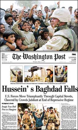 كان المانشيت الرئيسي للصحيفة هو «القوات الأمريكية تحرر بغداد من سيطرة صدام» وصاحب هذا التقرير صورة لجندي أمريكي يقبل وردة من طفلة صغيرة كانت وسط حشد أحاط به.. ثم كتبت تقول: ان بعض المشاعر الإنسانية قد فرضت نفسها في العراق منها ان أحد المواطنين قد خرج يبكي ويقول لا لصدام نعم لبوش.