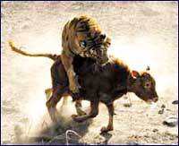 نمر اسمه (بالي) يقفز على عجل خلال تدريبه على الصيد في حديقة الحيوان في جينان شرق المقاطعة الصينية شاندونق، كان ذلك الدرس الأول في الصيد لذكر النمور خل.........