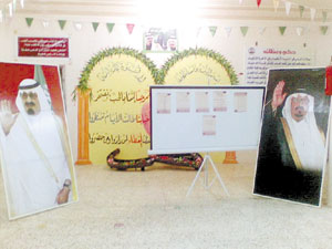 كما اشتمل الحفل على توزيع عدد من البروشورات وتعليق عدد من اللوحات داخل مبنى المدرسة وعلى الأسوار حيث تضمنت تلك اللوحات صور المؤسس وصور ولاة الأمر - حفظهم الله- إضافة إلى عبارات التهاني باليوم الوطني، وقدمت أنواع الحلويات والعصائر احتفاءً بهذه المناسبة.