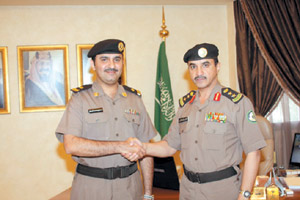قلد العقيد محمد بن حسن القحطاني.. مدير إدارة مرور محافظة جدة الرائد سلطان بن محمد الهماش.. مدير مرور المعارض بمحافظة جدة رتبته الجديدة مقدماً له التهنئة.. مبروك وعقبال الرتب العليا.