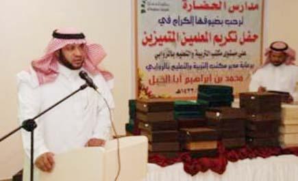 المشرف العام على الحفل فهد أبالخيل قدم الشكر والتقدير لجريدة الجزيرة على تغطيتها للمناسبات التعليمية والتربوية والتي من شأنها أن تساهم في تشجيع المتميزين في الميدان التربوي.