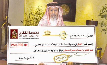 وتم السحب على الكوبون الفائز بالمسابقة بحضور منسوب الغرفة التجارية الصناعية بالرياض وقد تم تسليم الجائزة في مقر الإدارة العامة لمجموعة القفاري الكائن بالرياض بحضور الرئيس التنفيذي والعضو المنتدب للمجموعة الأستاذ قفاري بن صالح القفاري بتاريخ 9/ 10 / 2011م. تجدر الإشارة أن المسابقة لاقت إقبالاً كبيراً من قبل عملاء القفاري على مستوى فروعها المنتشرة بكل مدن المملكة، وتعد مجموعة القفاري على امتداد 40 عاماً من الشركات الرائدة في سوق المفروشات من سجاد وأثاث وموكيت وأرضيات خشبية وفينيل وورق جدران، مع امتياز مواصفاتها العالمية وتصاميمها المبتكرة وجودتها العالية وخدماتها المتميزة وذلك من خلال فروعها المنتشرة داخل المملكة وخارجها التي وصلت إلى 80 فرعاً ً متميزة بخدمة التوصيل والخدمة المتميزة لما بعد البيع، وهنأت الشركة الفائز متمنية حظاً أوفر للمشاركين في بقية المسابقات.