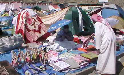 انتشر عدد كبير من الباعة على أرصفة منى منذ صباح أمس الأول عارضين عدد من البضائع التي يقوموا بتسويقها للحجاج وقام أولئك الباعة والذي غالبيتهم من الجالية الإفريقية إلى التسبب في زحام الممرات والشوارع الداخلية بين مقران الحجاج. وقد حاول عدد كبير من الكشافة والجهات الأمنية إلى منعهم وعدم السماح لهم بالافتراش وعرض بضائعهم.