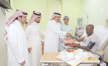 نيابة عن عميد كلية الطب والمشرف على المستشفيات الجامعية الأستاذ الدكتور مبارك بن فهاد آل فاران قام المدير التنفيذي لشؤون المرضى الأستاذ مطلق بن عبدالله الرشيد يرافقه الأستاذ عبدالرحمن المنصور مدير العلاقات العامة والأستاذ مسفر الأكلبي مدير علاقات المرضى والأستاذ فهد العبيد مدير الخدمات المساندة وعدد من المناوبين في مختلف الأقسام والإدارات بجولة معايدة على المرضى المنومين حيث زاروا أقسام التنويم المختلفة وكذلك قسم العناية المركزة وقسم الطوارئ للكبار والصغار وقدموا لهم التهنئة والهدايا التذكارية بمناسبة عيد الأضحى المبارك سائلين الله العلي القدير أن يمن عليهم بالشفاء العاجل كذلك قامت الأستاذة فريال العقيل ومها العكوز من علاقات المرضى بزيارة لأجنحة النساء وقامت الأخصائية الاجتماعية هناء الدباغ بزيارة لأجنحة الأطفال تم من خلالها تهنئتهم وتوزيع الهدايا عليهم ومشاركتهم فرحة العيد.