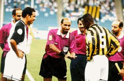 @ قادها تحكيما الدولي عمر المهنا وساعده فهد الملحم وعبدالله العباد,, ويؤخد على المهنا تغاضيه عن ضربتي جزاء احداهما للاتحاد عندما تعرض بهجا في الشوط الأول لعرقلة من الداود والأخرى للشباب عندما تعمد احمد جميل شد قميص يكيني في الشوط الثاني.