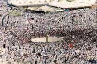 وبعد ان امضى الحجيج يوم الجمعة فوق جبل عرفات الذي القى فيه الرسول خطبة الوداع قبل اربعة عشر قرناً عادوا الى مخيماتهم في منى لتقديم الاضاحي تشبها بالنبي ابراهيم الذي افتدى الله ابنه اسماعيل بكبش، ولرمي الجمرات او رجم ابليس الذي يرمز الى الشر.