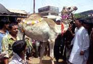 مجموعة من المشترين يعاينون أحد الجمال الهندية المعروضة للبيع في سوق للماشية في دكا أمس,, بعض التجار البنجلاديشيين اضطروا لاستيراد اعداد كبيرة من الجمال الهندية لمواجهة الطلب على الأضاحي هذا العام، خاصة ان الجمل يباع بسعر معقول حوالي 46000 تكا 1000 دولار أمريكي فقط.