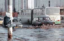 احد الاطفال يتسلق عمودا للانارة كي يراقب السيارات وهي تشق طريقها بصعوبة في المياه المتراكمة في شوارع موسكو امس,, الفيضانات ناجمة عن ذوبان كتل الجليد الموجود في الاماكن المنخفضة من المدينة.
