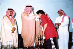 ليبدأ بعد ذلك الحفل الختامي للبطولة والذي بدأ بالقرآن الكريم ثم القى مدير المرحلة المتوسطة الاستاذ فهد البسام كلمة رحب فيها بسمو الأمير خالد بن طلال وتشريفه البطولة معتبراً ذلك اكبر تشجيع لابنائه الطلاب ودفعاً معنوياً كبيراً من سموه لهؤلاء البراعم، كما ان مدارس التربية النموذجية تتشرف باستضافة مثل هذه البطولة والتي تجمع ابناء المدارس وتقربهم من بعضهم وليتعرف بعضهم على بعض، ثم القى بعد ذلك احد طلاب مدارس التربية النموذجية قصيدة ترحيبية بسمو الأمير خالد بن طلال,, لتبدأ بعد ذلك المباراة النهائية والتي جمعت بين مدرستي التربيةالنموذجية والشمس الاهلية وقد استطاعت مدرسة الشمس الاهلية تحقيق الفوز بكل جدارة والحصول على كأس البطولة بعد فوزها بشوطين مقابل لاشيء، ليقوم بعد ذلك سمو الامير خالد بن طلال بتقليد الفائزين بالبطولة الميداليات الذهبية وكأس البطولة، كما تسلم لاعبو التربية النموذجية الميداليات الفضية، كما قدم سموه كأساً لافضل لاعب في البطولة وكأساً لافضل ضارب,, بعد ذلك توجه سموه الى حفل الشاي الذي اقامته مدارس التربية النموذجية تكريماً لسمو الامير خالد بن طلال,, هذا وقد عبر الامير خالد بن طلال عن سعادته الكبيرة بمشاهدته لمثل هؤلاء البراعم وهم يمارسون لعبة الكرةالطائرة، اذ ان مثل هؤلاء نواة اللعبة في المملكة وعن طريقهم واكتشاف مواهبهم يمكن الوصول الى افضل المستويات، كما ابدى سموه سعادته بالعدد الكبير من المدارس التي شاركت في هذه البطولة،ووجه سموه شكره وتقديره لمعالي وزير المعارف الدكتور محمد الرشيد ومدير عام التعليم بمنطقة الرياض الدكتور عبدالله المعيلي واللذين يساندان ويدعمان كافة الالعاب الرياضية داخل المدارس وتمنى سموه ان يسمع ويشاهد قريباً دورات رياضية في كافة الالعاب سواء الكرة الطائرة او غيرها بين المدارس، ويعود مرةاخرى دوري المدارس لكونها الانطلاقة الفعلية لجميع لاعبي الاندية والمنتخبات السعودية ووعد سموه بالوقوف والدعم لمثل هذه الدورات والبطولات التي تعود بفائدة كبيرة على وطننا الحبيب ومسيرته الرياضية التي يقودها امير الشباب وسمو نائبه.