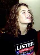 الممثلة الامريكية بروك شيلدز تستمع لسؤال احد الصحافيين اثناء المؤتمر الصحفي الذي عقدته الثلاثاء بالقاهرة، شيلدز تشترك مع 99 فناناً عالمياً في حملة دولية لجمع 99 مليون دولار لصالح الاطفال، كل فنان سيستمع لقصة طفل ثم ينقلها الى مسامع العالم بأسره.