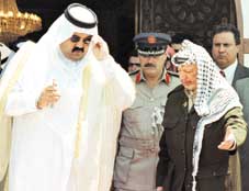 وكان الرئيس الفلسطيني ياسر عرفات في استقبال الامير الذي وصل على متن طائرته الخاصة، واستعرض الزعيمان حرس الشرف وعزفت موسيقى النشيدين الاميري القطري والوطني الفلسطيني.