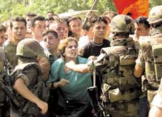 وتمكن الجنود الفرنسيون الذين كانوا يقفون جنباً الى جنب تدعمهم مركبات نقل افراد مدرعة ويتبعون حلف شمال الاطلسي من اعتقال رجل وكان نحو الف متظاهر اشتبكوا مع جنود الوحدة الفرنسية في متروفيتشا امس الاول (السبت).