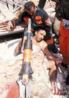 وقد استعد رجال الانقاذ باقنعة الاكسجين لامداد الصبي وشقيقته بكميات الاكسجين اللازمة بعد ان امضيا هذه المدة الطويلة تحت الانقاض منذ فجر امس.