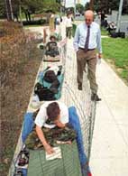 مواطن امريكي ينظر الى المحتجين الذين حبسوا انفسهم داخل اقفاص مؤقتة امام معهد الصحة الوطني في واشنطن,, المحتجون يشاركون في اضراب عن الطعام لمدة اربعة ايام احتجاجا على استخدام الثدييات الرئيسية في الابحاث الطبية.