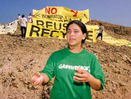 مندوبة مجموعة السلام الخضر في لبنان زينة الحاج تتحدث الى مراسلي الصحف عند موقع نورماندي لدفن النفايات في بيروت بينما يقوم ناشطون آخرون بعمل احتجاج سلمي بموقع دفن النفايات ضد استيراد مواقد جديدة وإلقاء الضوء على مخاطر مدافن النفايات وتأثيرها على الساحل اللبناني والنظام البيئوي البحري.
