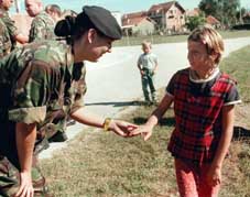 جندية من لواء ويست المتعدد الجنسيات تدردش في ود مع تلميذة كوسوفية أمام مبنى المدرسة الثانوية التي أعيد فتحها في مدينة كلينا غرب العاصمة بريشتينا بحوالي 60كلم, المدرسة الثانوية أعيد بناؤها بمساعدة دولية خلال الشهور القليلة الماضية.