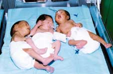 واوضح د, علاء الدين الهلالي ان السيدة حملت هذا الحمل ثلاثي التوائم وتمت متابعة حالة المريضة من بداية حملها حيث اجريت لها في الشهر الثالث من الحمل عملية ربط عنق الرحم بغرض تفادي حدوث اجهاض لها واطالة فترة الحمل واشار الى انه من المعروف علميا ان احتمال الاجهاض في مثل هذه الحالة قد يصل الى اكثر من 60% وقد وصل الحمل في هذه الحالة الى الاسبوع الثالث والثلاثين اي الشهر الثامن وقد تمت ولادة الاطفال الثلاثة بعملية قيصيرية والتوائم الثلاثة هم بنتان وولد, وقد بلغ وزن البنت الاولى 1,500كجم وبلغ وزن البنت الثانية 1,550كجم كما بلغ وزن الطفل الثالث الذكر 1,700كجم وتم ادخالهم الى الحضانة (قسم الاطفال المبتسرين) واوضح الدكتور علاء الدين الهلالي ان حالة التوائم الثلاثة جيدة ويتلقون العناية اللازمة.