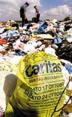 اثنان من الشرطة الايطالية يفتشان وسط مدفن النفايات حيث تم العثور على بعض الملابس وألعاب الاطفال والبطانيات المتجهة الى كوسوفا او اليونان وتركيا,, حوالي 100 طن من هذه السلع القديمة وجدت خلف ملعب كرة القدم بمدينة كاسال دي برينسبي في جنوب ايطاليا وهو المكان الذي يعد بمثابة قلعة للمجرمين وعصابات المافيا ولا تزال الشرطة الايطالية تحقق في الأمر.