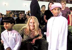 عارضة الازياء الشهيرة كلوديا شيفرز تأخذ وضع التصوير مع طفلين من الامارات اثناء حضورها مباراة في البولو بمدينة أبوظبي, كلوديا متواجدة في الامارات للمشاركة في عرض للحلي والمجوهرات بنادي غانتون للسباق والبولو.