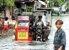 دراجة نارية بثلاث عجلات (تروسيكل) محملة بالمسافرين تمخر عباب الطريق المغمور بالماء بسبب الفيضانات في العاصمة الفلبينية مانيلا بعد هطول الأمطار الغزيرة.