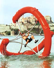 رجل يحاول السير على الماء بمساعدة اختراعه الجديد بمدينة كالفي في كورسيكا ضمن فعاليات مهرجان الريح الثامن المخصص للفن والموسيقى والعلوم والرياضة.