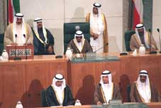 والقى الشيخ جابر في مستهل الجلسة التي عقدها المجلس لهذا الغرض كلمة النطق ايذاناً ببدء اعمال الدورة الجديدة للمجلس ثم القى جاسم الخرافي رئيس المجلس كلمة قال فيها: ان العالم يشهد حالياً تحولات واسعة المدى وعميقة الجذور افضت الى نظام دولي جديد تتفجر منه المعرفة الانسانية وتتقلص فيه المسافات , مضيفاً ان علينا ونحن بلد صغير ادراك كل ما يحمله لنا ذلك من تحديات ومخاطر وشحذ الهمم لمواجهتها ومواكبة تيار الحياة والنظر للمستقبل بعين التفاؤل .