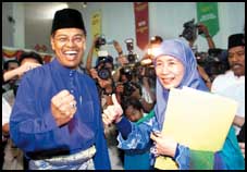 وان عزيزة وان اسماعيل رئيسة حزب العدالة الوطني المعارض ترفع اصبع الابهام بينما يقوم خصمها ابراهيم سعد من ائتلاف الجبهة الموحدة باظهار قبضته بعد تقديم اوراق ترشيحهما في بينانج حيث تدخل وان عزيزة زوجة الوزير انور إبراهيم المسجون سباق المقعد البرلماني عن دائرة بيرماتنج يوه,, ماليزيا تعقد الانتخابات العامة العاشرة في 29 نوفمبر الحالي.
