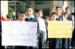 * بيروت لبنان رويترز:اطفال مدارس لبنانيون يحملون لافتات ويهتفون هتافات معادية لاسرائيل احتجاجاً على الهجوم الاسرائيلي , 15 تلميذاً اصيبوا بجروح بعدما اطلق جيش لبنان الجنوبي الموالي لاسرائيل قنبلة هاون على المدرسة في قرية عرب سليم.