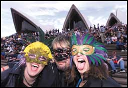 ثلاثة استراليين مقنعين يجتمعون بالقرب من دار اوبرا سيدني امس استعدادا للعام الجديد حيث شارك الاف الاشخاص المولعين بالقصف والمرح في التفرج على عرض الالعاب النارية الذي بلغت تكلفته 9، 3 ملايين دولار امريكي وقد احتفلت مدينة سيدني برأس السنة قبل 11 ساعة من توقيت جرينتش وحضره حوالي مليون شخص،