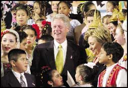 الرئيس الامريكي بيل كلينتون وحرمه هيلاري يقفان مع اطفال يمثلون دولا من كل انحاء العالم في مركز رونالد ريجان الدولي في واشنطن دي سي وذلك ضمن فعاليات مناسبة الحقبة الالفية في العالم.