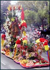 قارب شركة سبرينكلر للطيور الاستوائية المعروف باسم ملتقى الغابات الاستوائية يتهادى في شوارع باسادينا اثناء مهرجان مسابقة الزهور رقم 111، القارب ارتفاعه 28 قدماً وهو مزين بأشكال متنوعة من الأزهار التي شكلت تسعة من طيور الببغاء وسط جو من الغابات الاستوائية الرائعة, وقد فاز هذا العمل بجائزة المسابقة كأحسن عمل باستخدام الزهور ضمن فعاليات احتفالات العام 2000 رؤى المستقبل .
