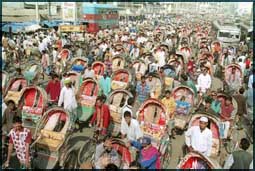 آلاف من عربات الركشة تحتشد في احد شوارع دكا القديمة حيث ذكر مسئولو البلدية بالعاصمة البنجلاديشية ان هناك 300 الف عربة ركشة في المدينة من العربات التي لديها رخصة سارية المفعول ولكن العربات التي ليس لها رخص صالحة يصل عددها الى ضعف الرقم السابق مما يتسبب في مشاكل مرورية مزمنة على حد تصريحات شرطة المرور في دكا.