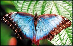 فراشة المورفو الزرقاء تقف على ورقة خضراء في حديقة الفراشات التي يملكها المواطن الأمريكي جوريس برنكرهوف في بلدة جوتشيما شمال غرب العاصمة الكوستاريكية سان خوسيه.