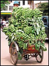 سائق كمبودي يقود دراجته المثقلة بالموز بدلا من الركاب ويشق طريقه عبر الشوارع المزدحمة لتوزيع الموز على المتاجر حول المدينة حيث يعمل العديد من السائقين في العاصمة الكمبودية كموزعين للمواد الغذائية بالاضافة الى عملهم الأصلي وهو نقل الركاب.