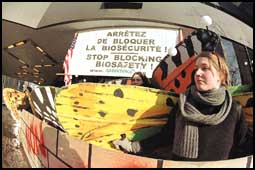 ناشطتان من حركة السلام الاخضر ترتديان زي الفراشات أثناء تظاهرة في مدينة مونتريال الكندية حيث طالب المتظاهرون بأن توقف الولايات المتحدة وكندا اعتراضهما على مفاوضات الأمن الحيوي والاتفاق مع غالبية الدول على اقامة قوانين دولية لضبط ورقابة الكائنات الحية التي تدخل فيها الهندسة الوراثية.