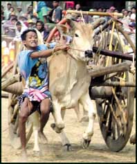مزارع تايلاندي يحاول كبح جماح ثوره الذي هاج في سباق في منطقة بيتشابوري الريفية اثناء فعاليات مهرجان محلي حيث يتنافس فيه المزارعون على شرف الأبهة والفخار في مناسبة تقليدية بحيث يحصل الفائز الأكبر في السباق على بقرة اخرى تعينه في مزرعته او حقله.