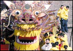 متطوعون مشاركون في بناء وتركيب أكبر تنين في العالم يجتمعون حول رأس التنين عند سور الصين الكبير في بادالينج شمال بكين حيث احتفل أكثر من 6 آلاف شخص بمهرجان الفوانيس عن طريق تركيب ونصب بعض القطاعات في التنين الذي يبلغ مقاسه 3050 مترا وتميز الاحتفال أيضا بالغناء والرقص.
