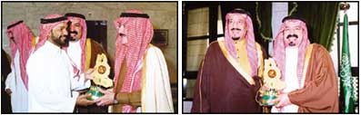 وفي نهاية الاستقبال قدم سمو الأمير بندر بن محمد بن سعود الكبير درع النادي لسمو أمير منطقة الرياض عرفاناً للجهود المتميزة التي بذلها سموه في انجاح مسابقة المؤسس الملك عبدالعزيز رحمه الله .