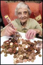 العجوز فران همفريس (84 عاما) في لقطة لها في منزلها في تيوكسبري في بريطانيا مع البنسات التي جمعتها في أنبوبة حلوى سمارتيز لمدة 17 عاما وقد بلغ الذي جمعته طوال هذه السنين عشرة آلاف جنيه استرليني (حوالي 15 ألف دولار امريكي).
