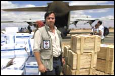 جان لوك كريستو أحد موظفي الخارجية الفرنسية يراقب وصول 40 طناً من المعونات الى بلدة جود الأثيوبية حيث يواجه 8 ملايين من الأثيوبيين خطر الموت جوعاً بعد 3 سنوات من الجفاف والجدب أدت إلى جفاف الآبار وهلاك الماشية.