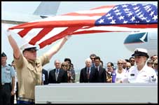 السيناتور الأمريكي الجمهوري جون مكاين وسط وبجواره السفير الأمريكي في فيتنام بيت بيترس يسار وزوجة مكاين سندي الثانية من اليمين يقفون في وضع انتباه اثناء خفض العلم على نعش واحد من ستة جنود أمريكيين قتلوا ابان الحرب الفيتنامية ويجري تسليم رفاتهم الى الولايات المتحدة الأمريكية وسط مراسم بمطار هانوي.
