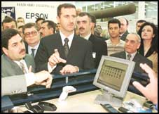 بشار الأسد نجل الرئيس السوري حافظ الأسد يستمع الى شرح عن نموذج متطور من أجهزة الكمبيوتر اثناء جولة له في معرض خاص بأحدث تقنيات الكمبيوتر في مدينة دمشق حيث يقود حملة ادخال الكمبيوتر الى البلاد على نطاق واسع.