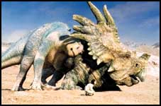 ديناصور يحاول مساعدة زميله الذي يشكو من العطش الشديد وتحفيزه على النهوض اثناء رحلتهما عبر الصحراء وذلك في أحد مشاهد الفيلم الجديد ديناصور الذي انتجته ديزني والذي صنع بالكامل باستخدام الكمبيوتر والصور المتحركة وسوف يعرض الفيلم بالولايات المتحدة في 19 مايو الحالي.