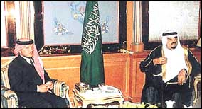 رأس خادم الحرمين الشريفين الملك فهد بن عبدالعزيز آل سعود وأخوه جلالة الملك عبدالله الثاني ملك المملكة الاردنية الهاشمية، جلسة المباحثات السعودية - الأردنية في الديوان الملكي بقصر السلام مساء أمس.