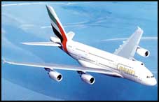 صورة للطائرة إيرباص طراز (A3xx ) وعليها شعار الخطوط الجوية الإماراتية وقد أعلنت شركة إيرباص عن عزمها على بدء رحلات سوبر جامبو قريباً وهى تتوقع وصول 50 طلبية من خمس دول لشراء هذا الطراز من الطائرات العملاقة التي تستوعب مايزيد عن 400 مسافر وسوف تكون الطائرات جاهزة بحلول العام 2005م.