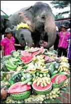 الأفيال تستمتع بتذوق وجبتها المكونة من تشكيلة مختلفة من الفواكه والخضروات الاستوائية أثناء وليمة أقيمت بمناسبة يوم صحة الفيل التايلاندي بمدينة تشوبنوري وعادة ما تحظى الأفيال بمكانة عالية في التاريخ التايلاندي.