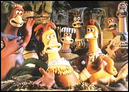 مشهد من الفيلم الكارتوني الجديد (هروب الدجاج) تظهر فيه شخصية الديك روكي (وسط ) بصوت الممثل ميل جيبسون ويحكي هذا الفيلم قصة مجموعة من الدجاج حوصرت خلف أسلاك شائكة وتفكر بالهرب من المزرعة باستخدام طرق مضحكة وسوف يعرض الفيلم بالولايات المتحدة اعتباراً من الغد.